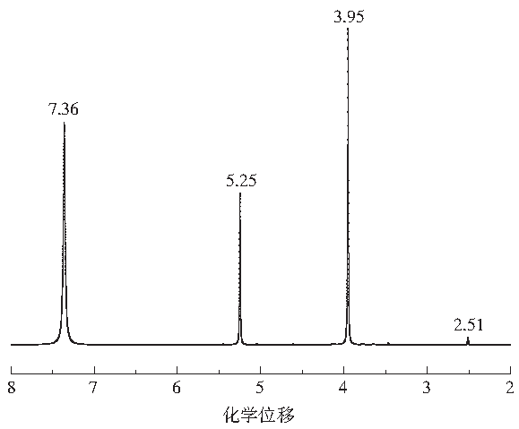 PADTC的1H和13C核磁共振光譜如圖2和圖3所示。在圖2氫譜中,化學位移為5.25、3.95、7.36的峰分別屬于—­­C­­H2、—CH2—CH2和NH4+中的氫。在圖3碳譜中,70.92、51.18和208.67的化學位移屬于—CH2、—CH2—CH2和—S—C═S中的碳。
