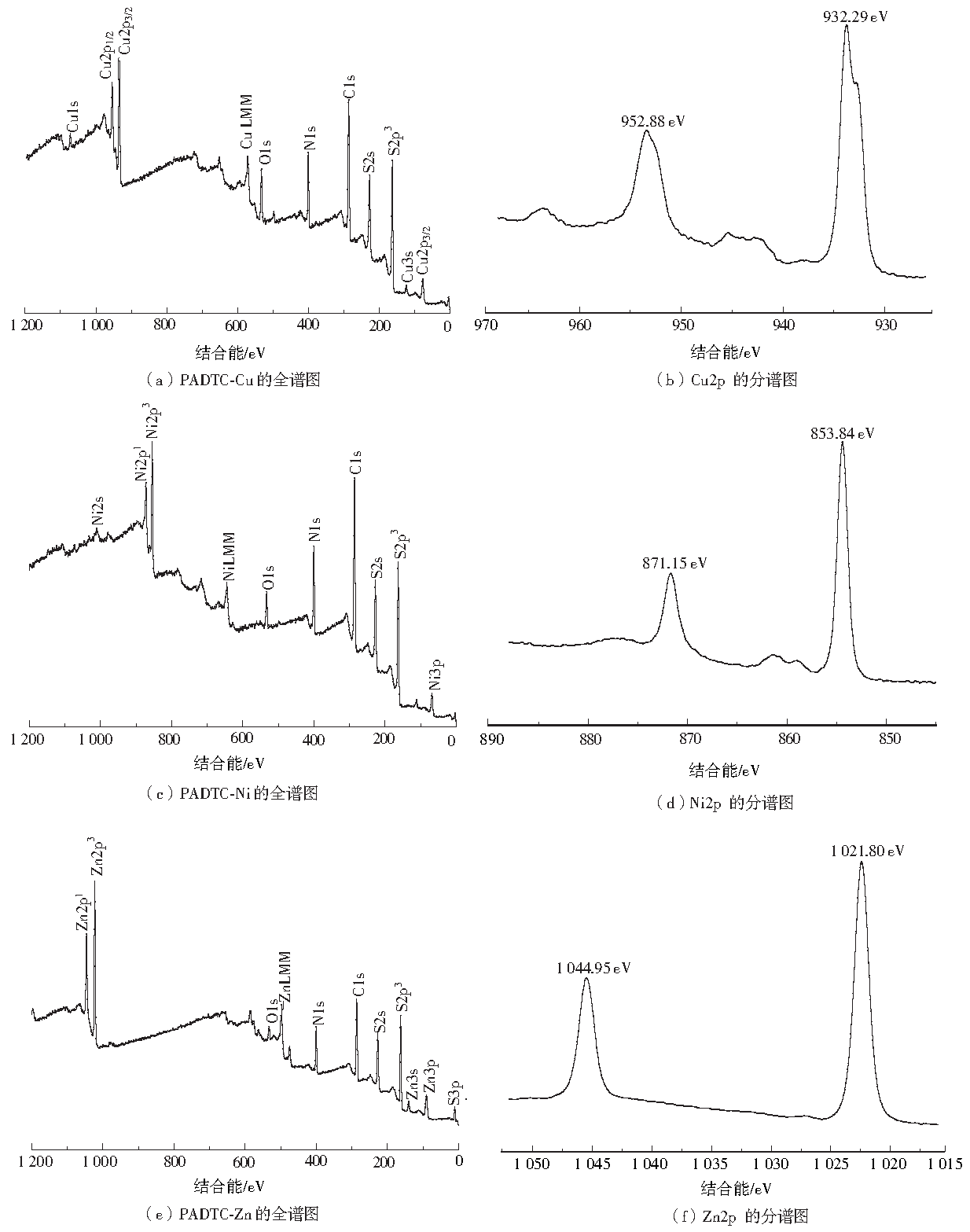 PADTC抓捕重金屬后沉淀PADTC-Cu、Ni和Zn的XPS如圖7所示。Cu1s的高分辨光譜位于1 070.79 eV處,Cu2p1/2、Cu2p2/3和Cu3p2/3的峰分別在952.88、932.29和77.02 eV,如圖7(a)和圖7(b)所示。S2s和S2p3的結合能分別位于227.70和162.83 eV處,由此可以推斷出S一Cu的存在[24]。Ni3p的高分辨率光譜位于66.22 eV,分別在871.15和853.84 eV處觀察到Ni2p1和Ni2p3的峰,如圖7(d)所示,因此證明了Ni2+的存在。此外,S2s和S2p3的結合能位于227.26和160.79 eV,這表明PADTC-Ni沉淀中存在S一Ni鍵。Zn2p的高分辨率光譜如圖7(f)所示,在1 021.80 eV(Zn2p3/2)和1 044.95 eV(Zn2p1/2)處,表明沉淀PADTC-Zn中Zn2+的存在,S2s和S2p3的結合能分別位于227.30和160.81 eV處,這表明沉淀中S—Zn的存在。531.80 eV處的O1s的峰值表明,可能是因為沉淀暴露在空氣中被氧化一部分,從而有O1s 的峰的出現。